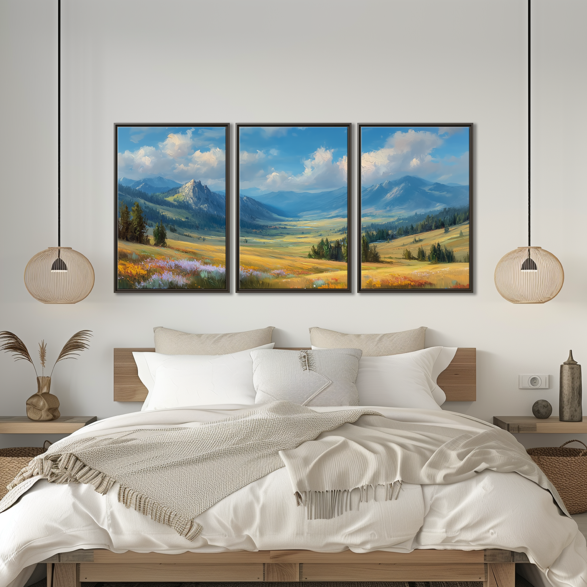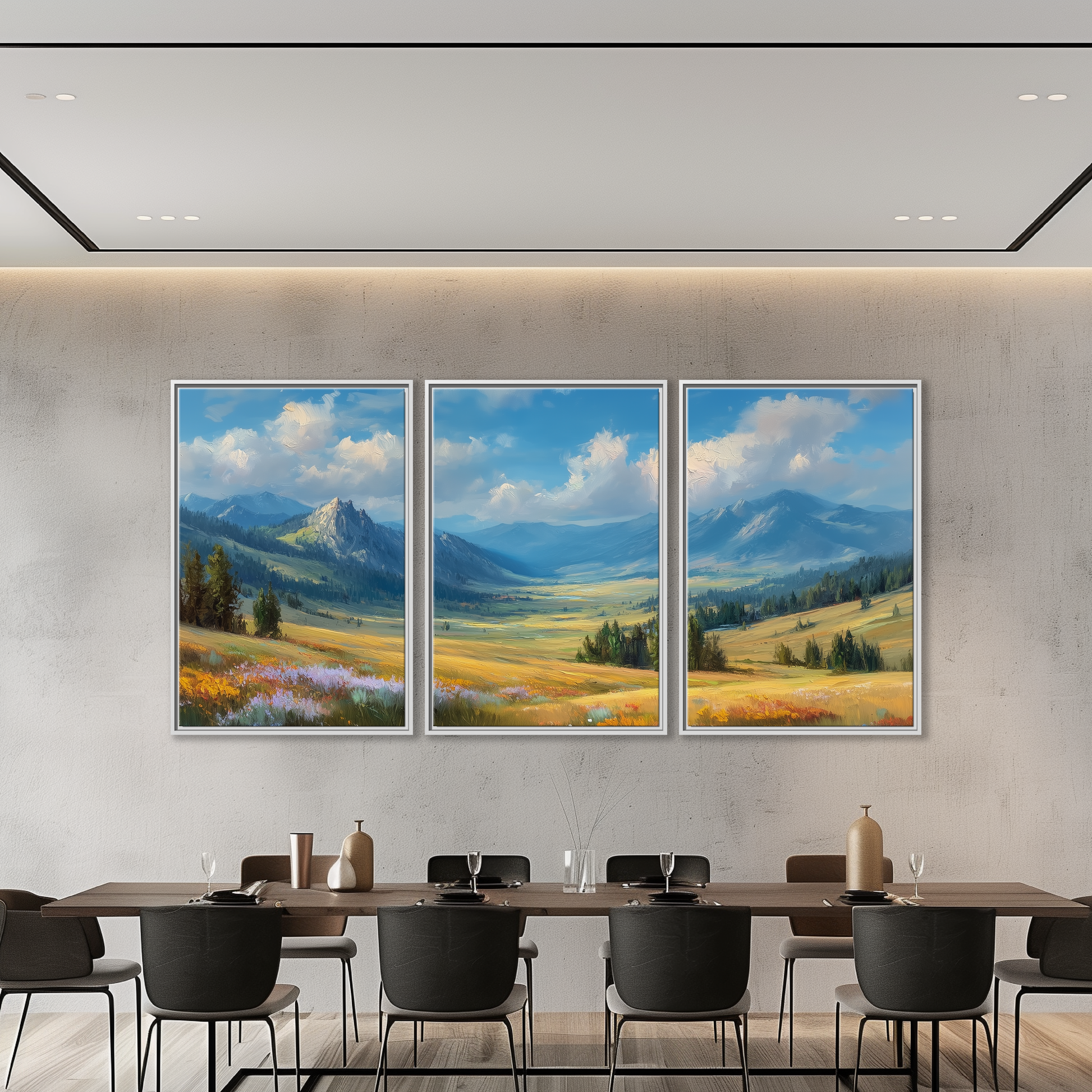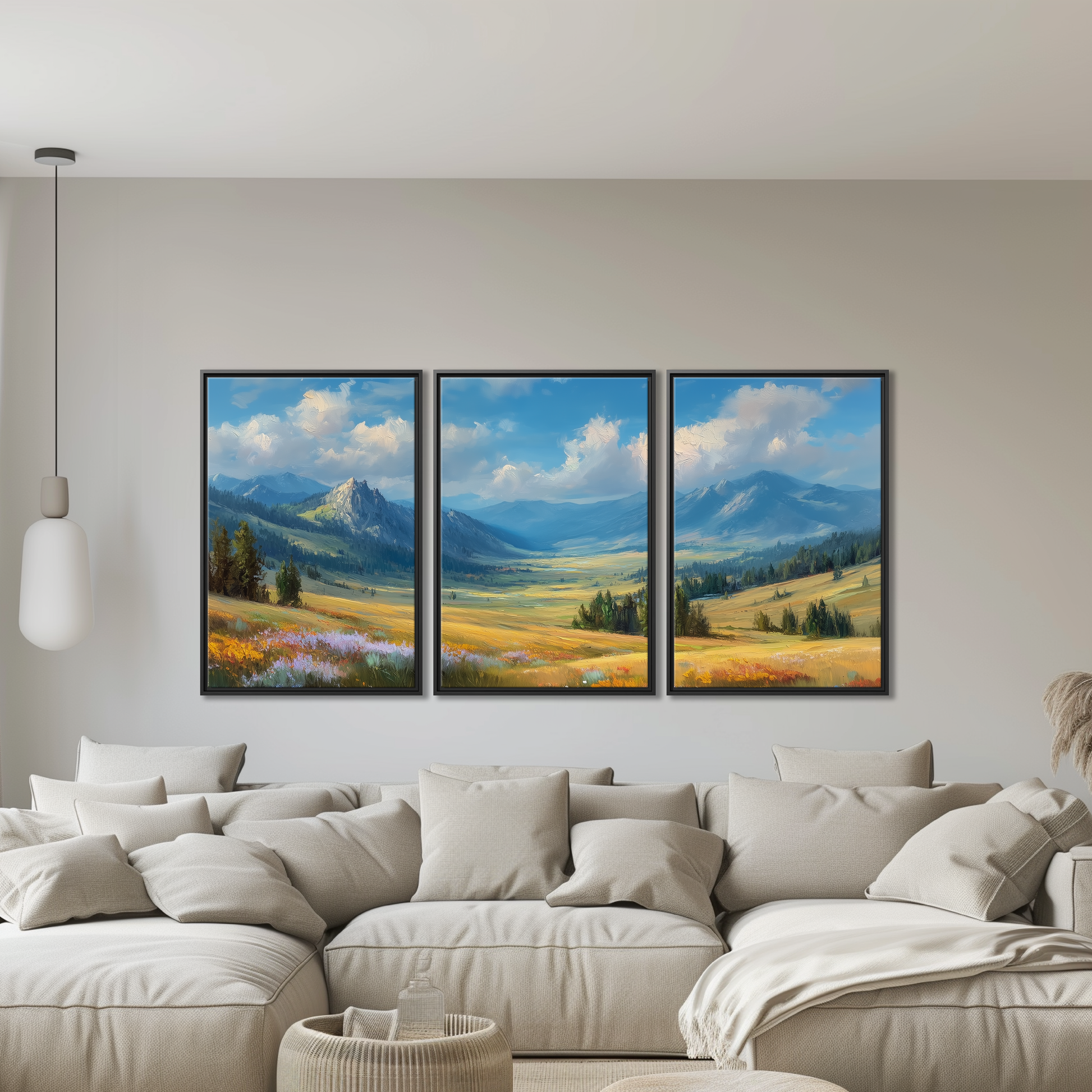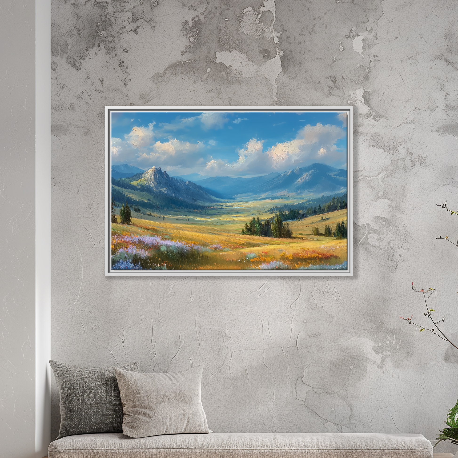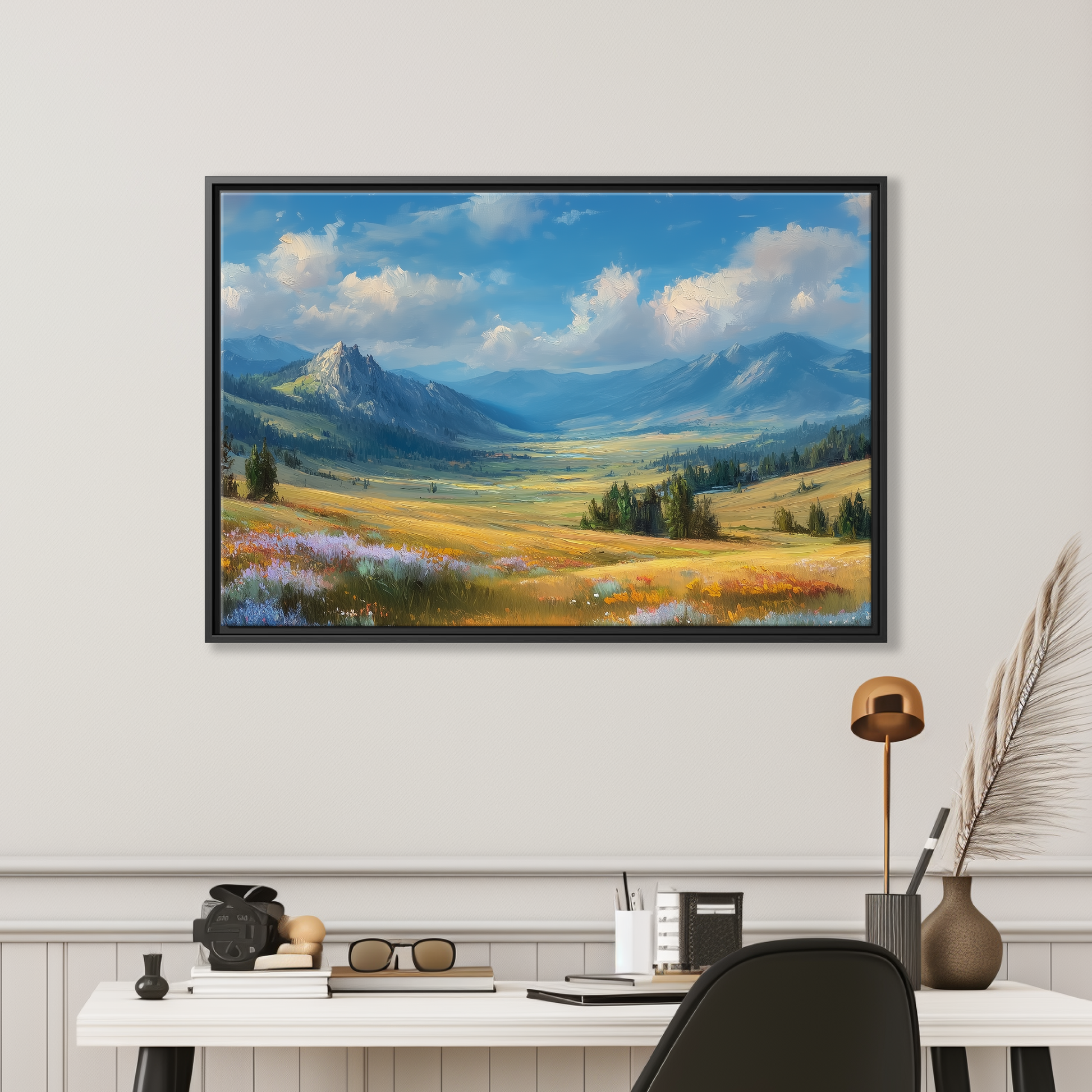 Immerse yourself in the serene beauty of the Bighorn Mountains with this exquisite canvas print, inspired by the vibrant wildflower meadow that blankets Wyoming's rolling terrain. Each brushstroke captures the delicate purple lupine, golden grasses, and white daisies that define this high country design, bringing a scenic adventure into your home. Perfect for nature lovers and those who cherish panoramic vistas, this artwork transforms any space with its impressionist vistas and rich color palette.