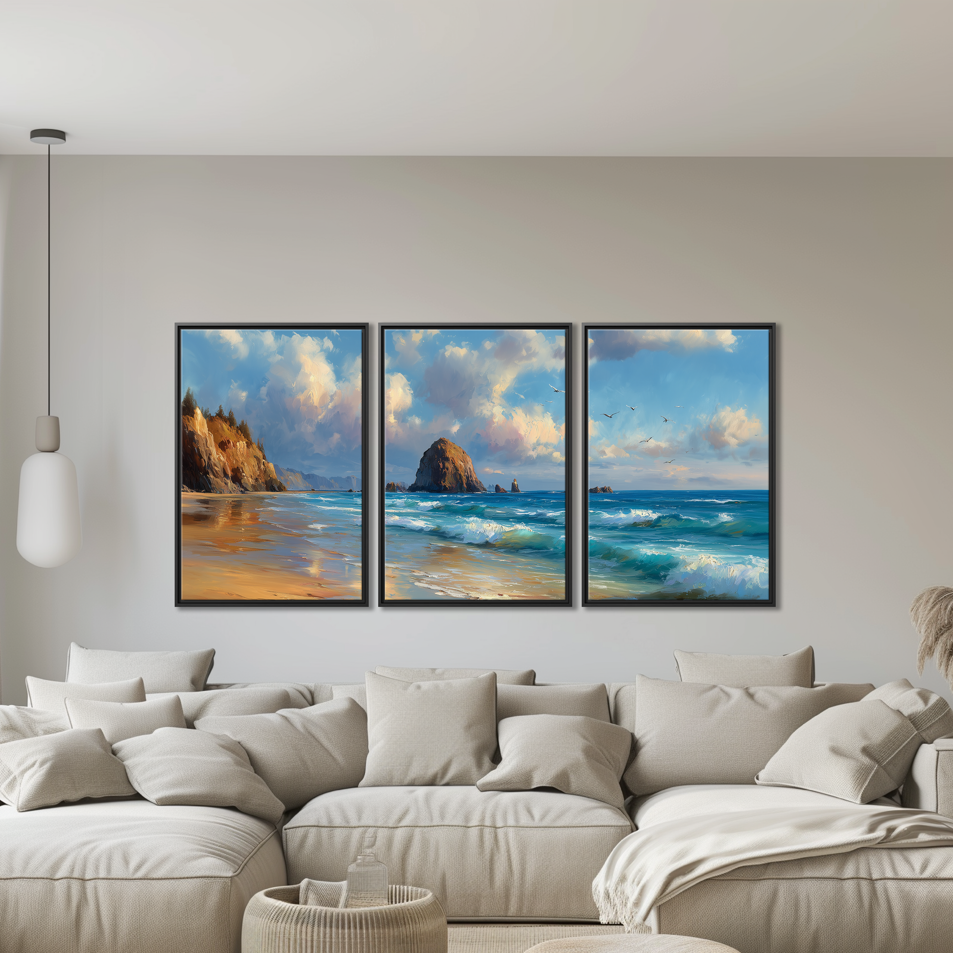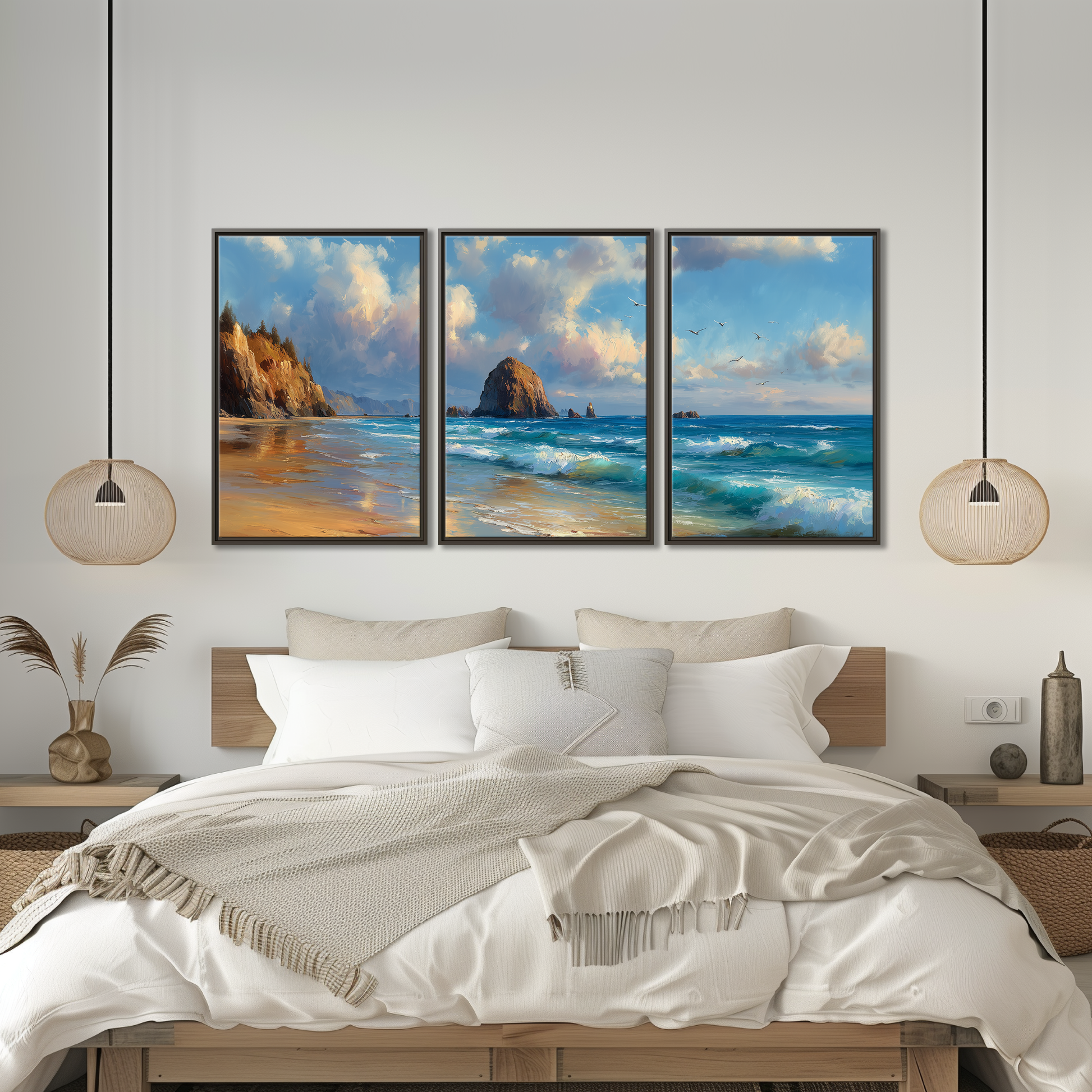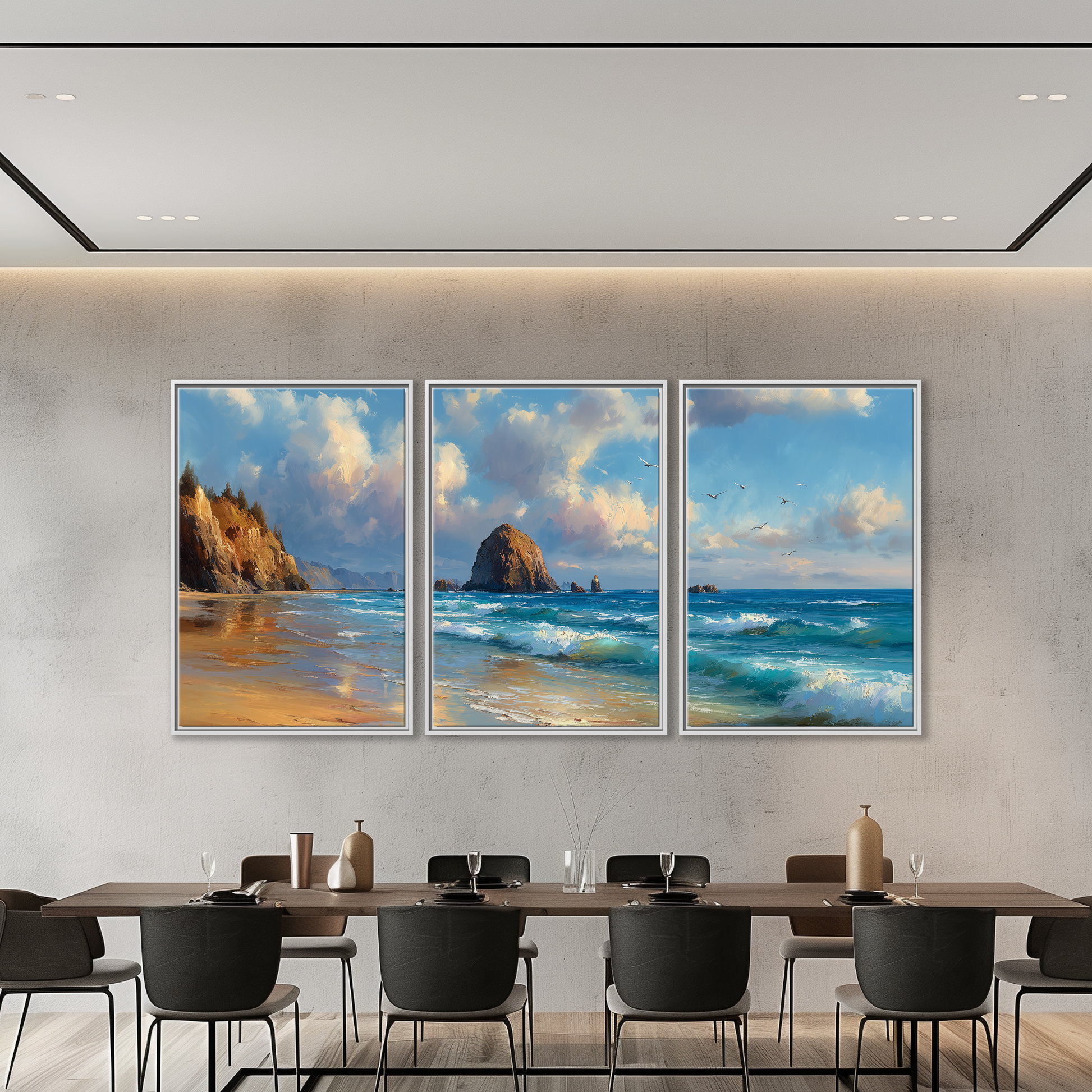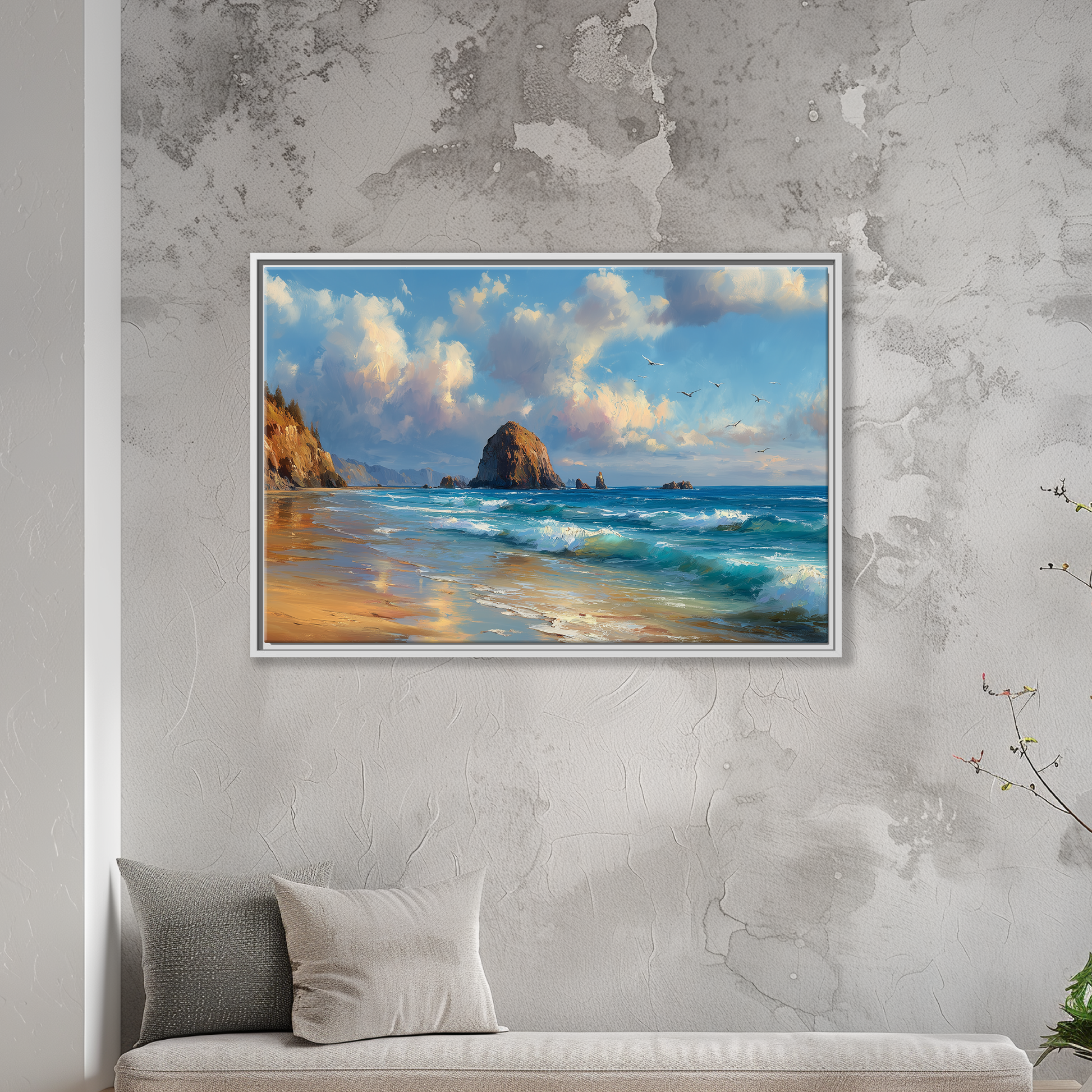 Immerse yourself in the tranquil beauty of the Oregon coast with this exquisite Cannon Beach art print, capturing the iconic Haystack Rock bathed in the warm glow of golden hour. Inspired by the breathtaking Pacific Ocean scene, this seascape landscape brings the serene charm of coastal sunsets right into your living space. Perfect for beach house decor or as a thoughtful vacation home gift, it celebrates the natural splendor of the Northwest display.