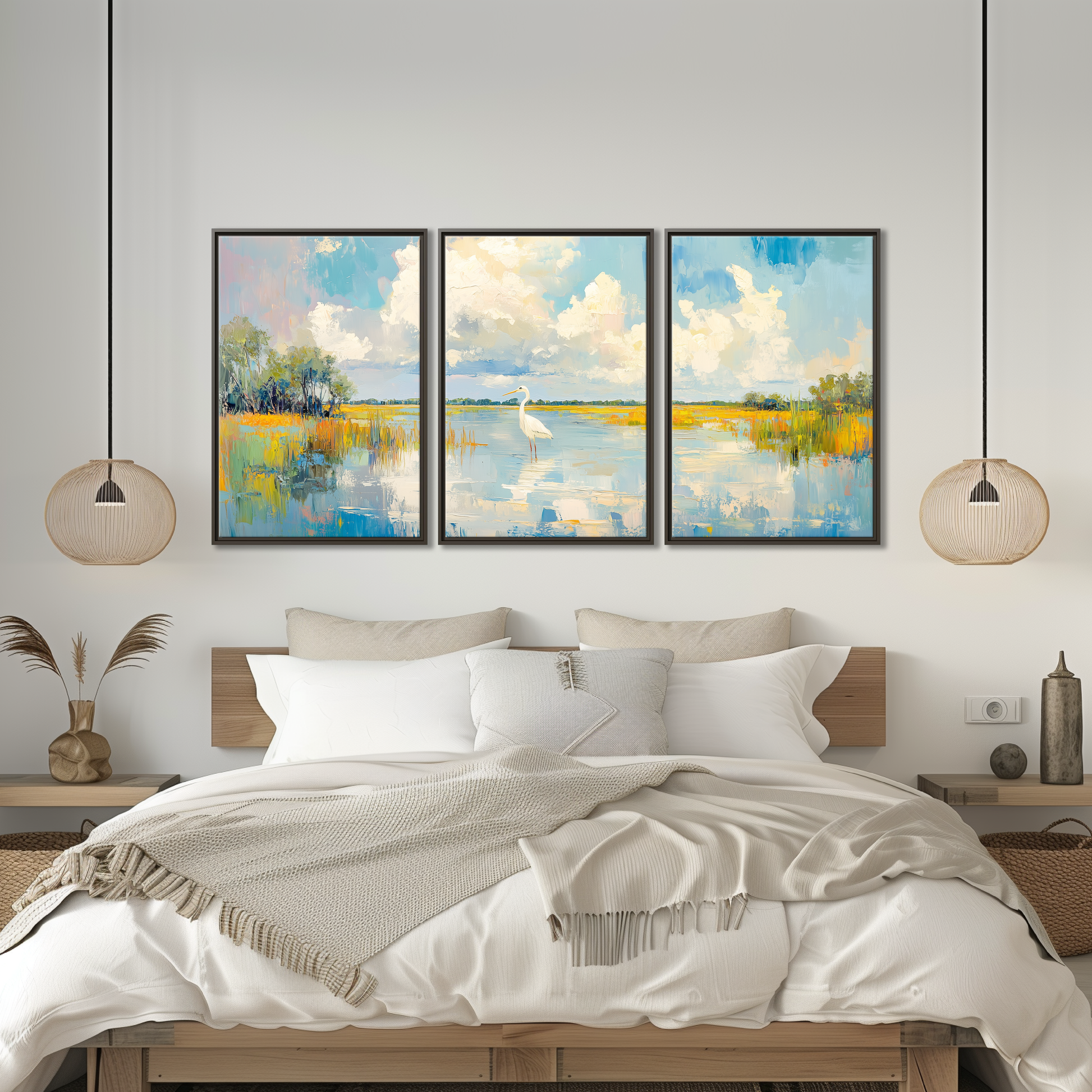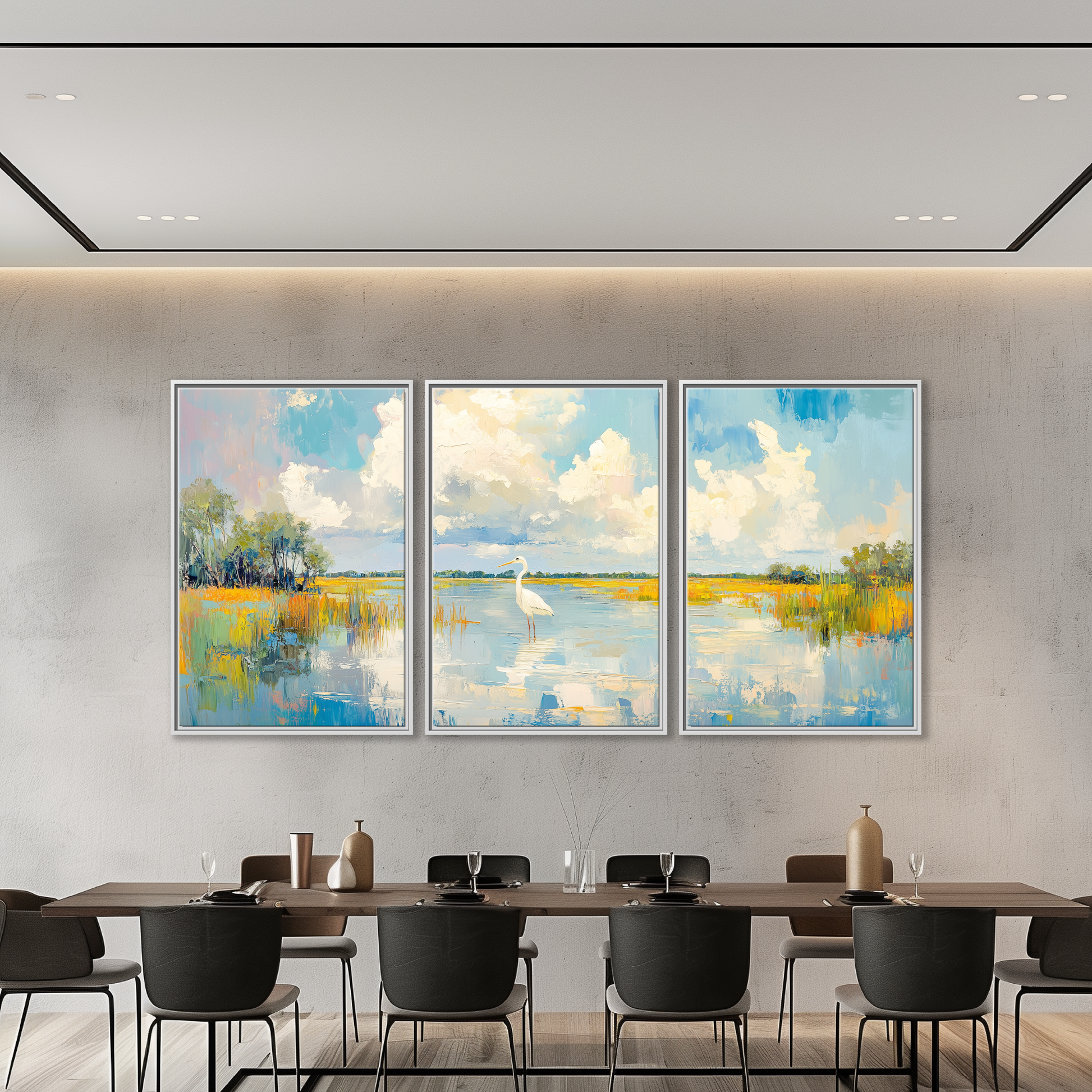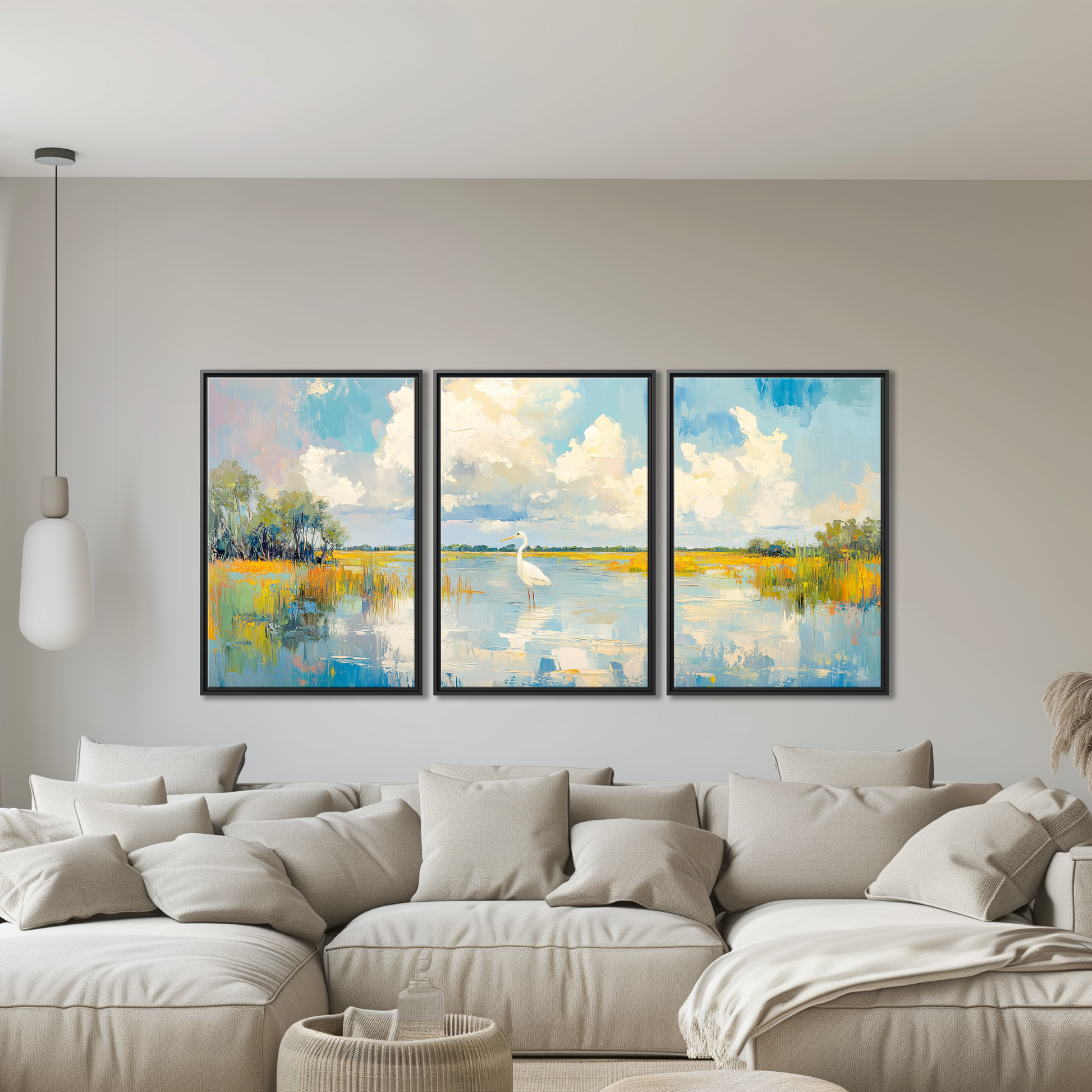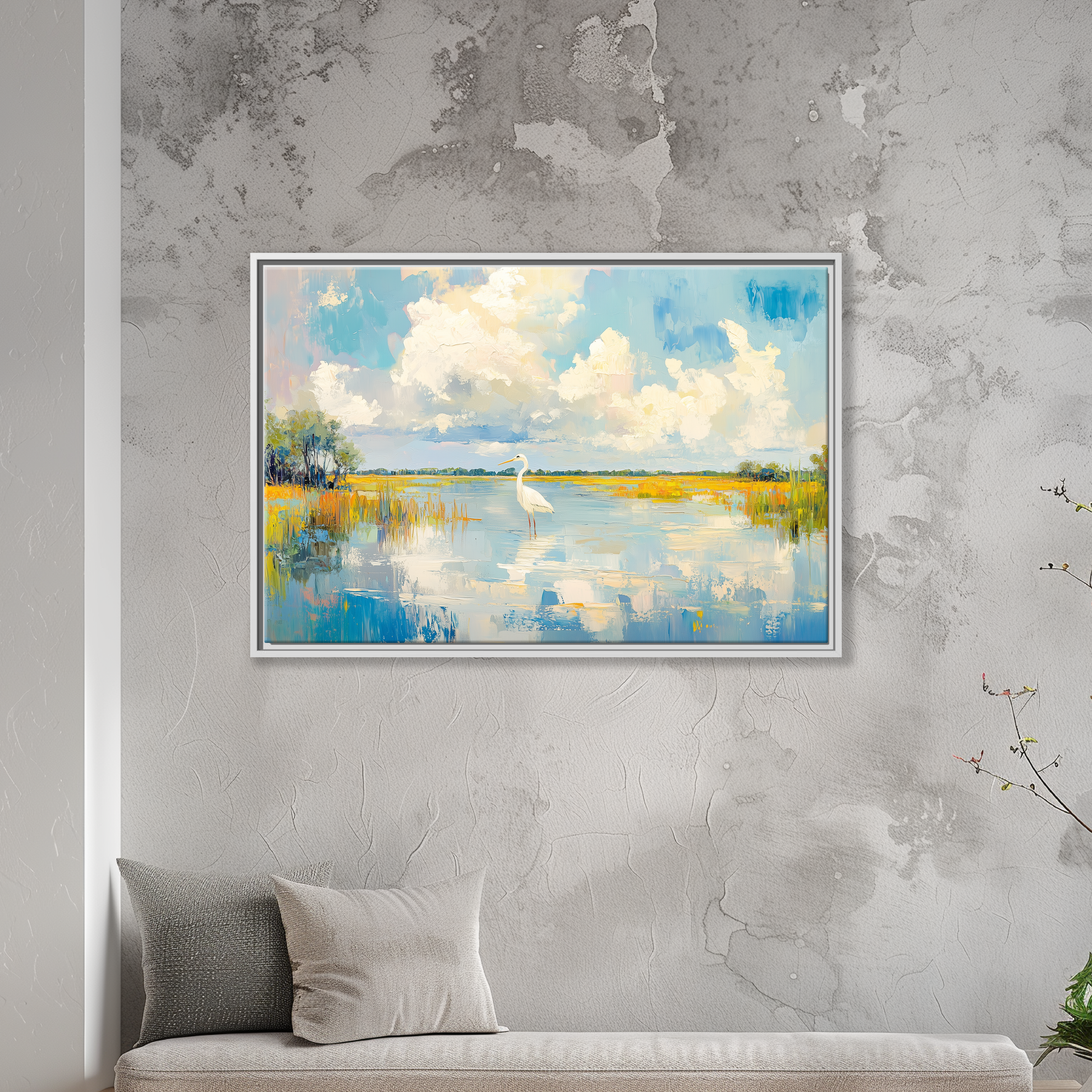 Immerse yourself in the serene beauty of Florida's wetlands with this captivating coastal marsh canvas art. Inspired by the tranquil Everglades and featuring a graceful white egret, this piece brings a touch of peaceful water print charm to any space. Perfect for lovers of southern marsh art and coastal bird decor, it evokes the calm and quiet elegance of nature’s hidden corners.