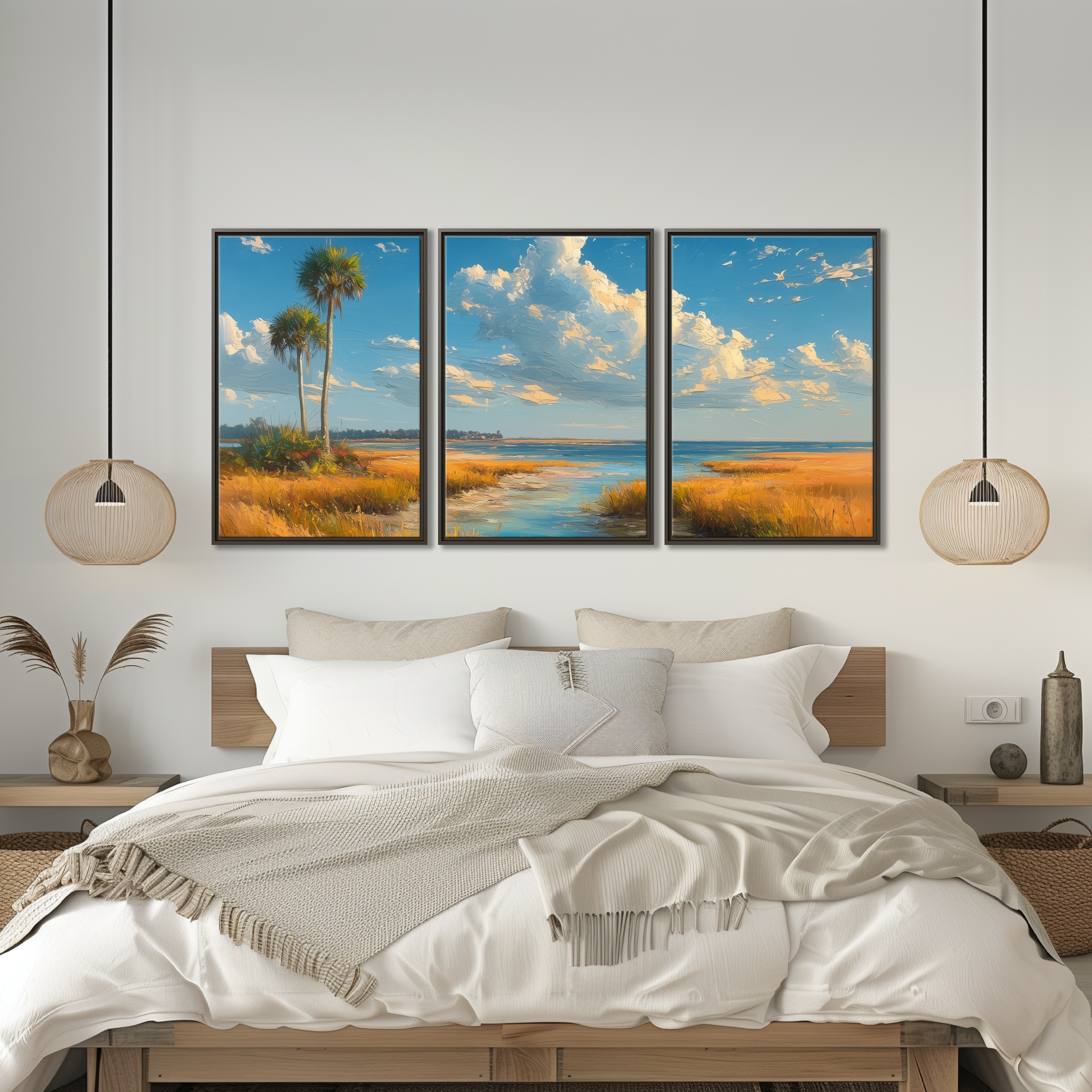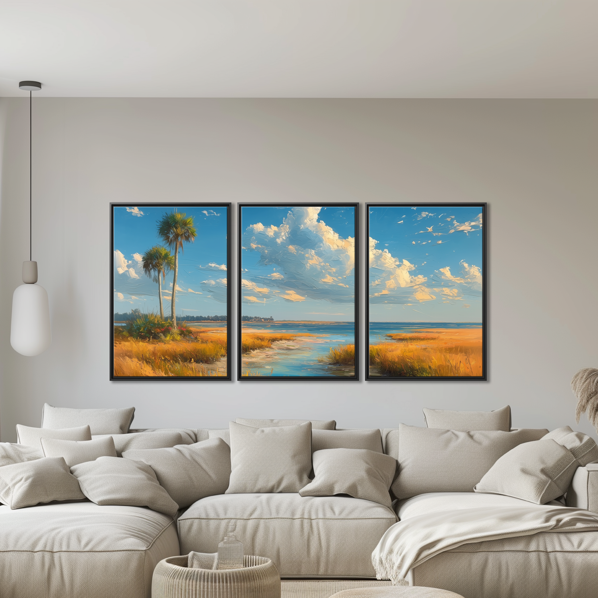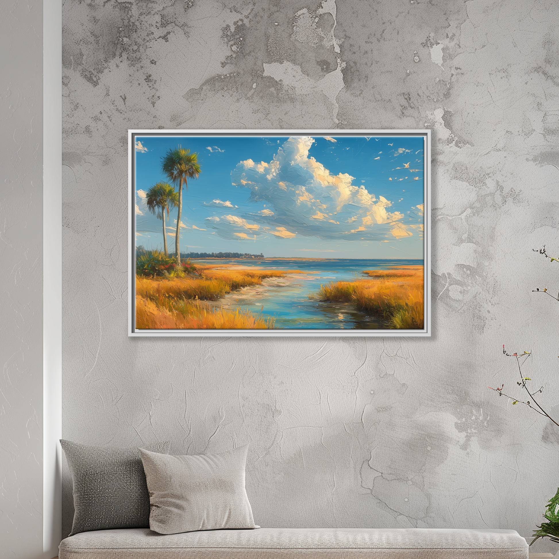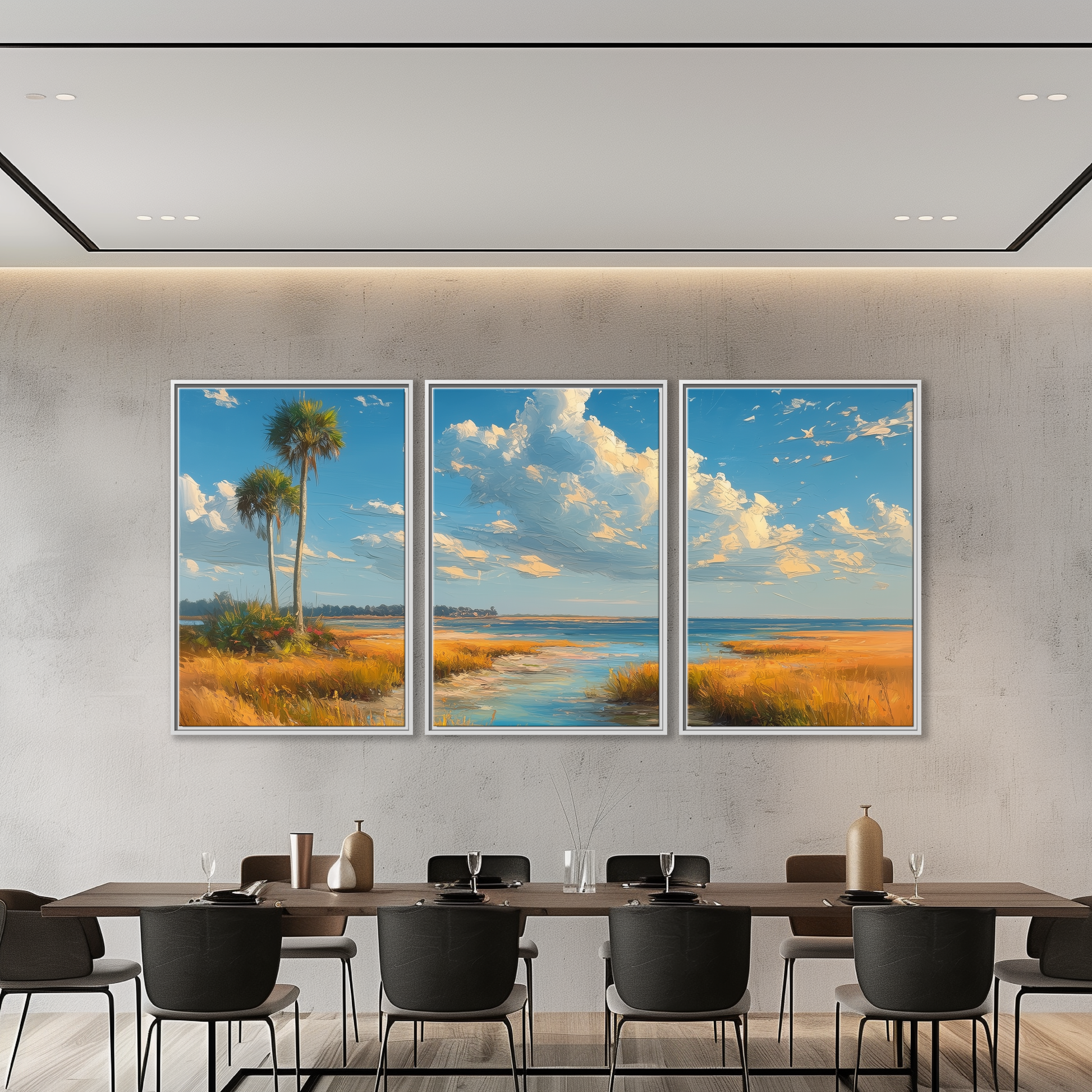 Immerse yourself in the serene beauty of the Florida Everglades with this stunning tropical wetlands canvas wall art. Inspired by the iconic sawgrass prairie and framed by coastal palm trees, this piece captures the essence of a pristine ecosystem alive with soaring birds and golden grasslands. Perfect for those who cherish national park prints or seek to bring a touch of nature's sanctuary into their home or office.