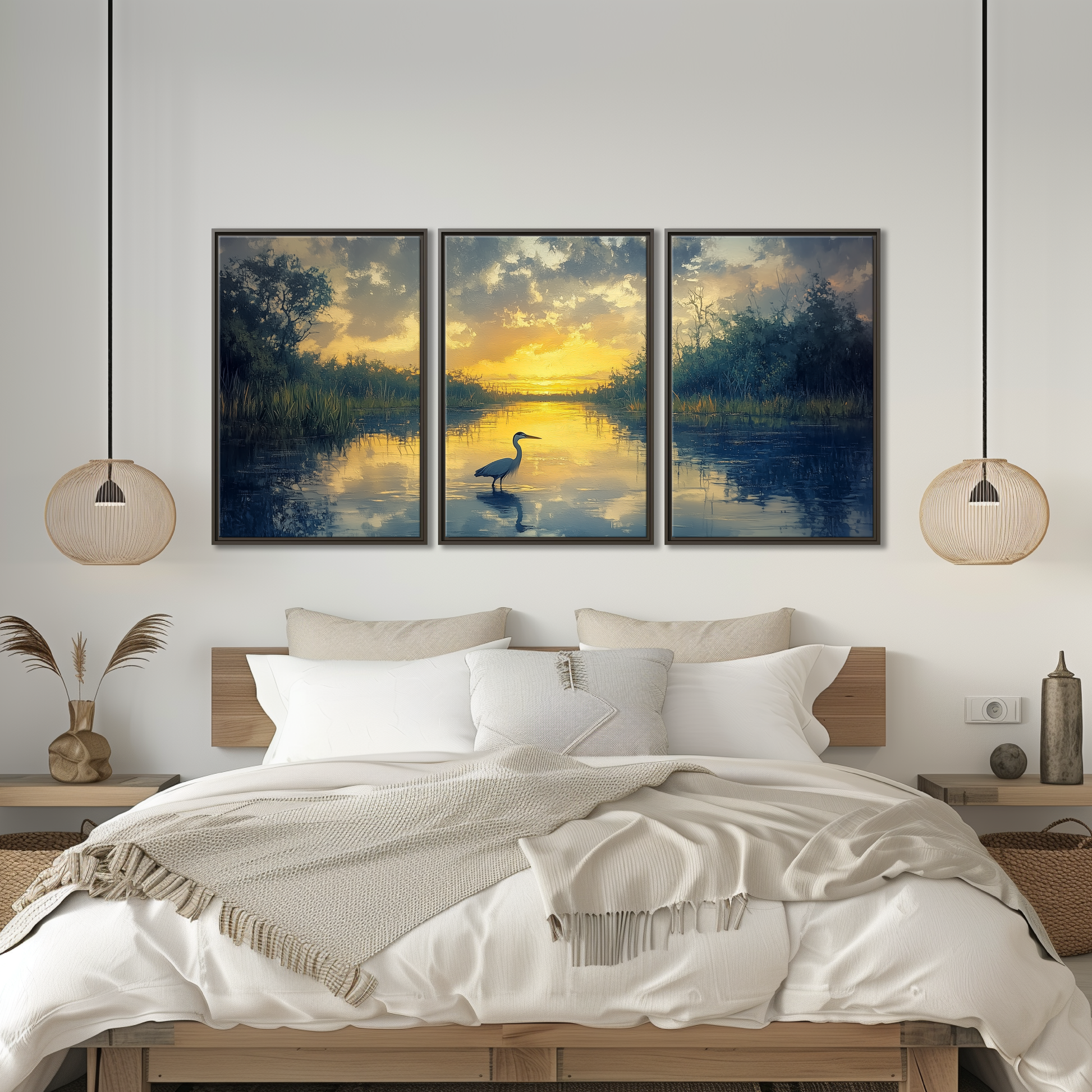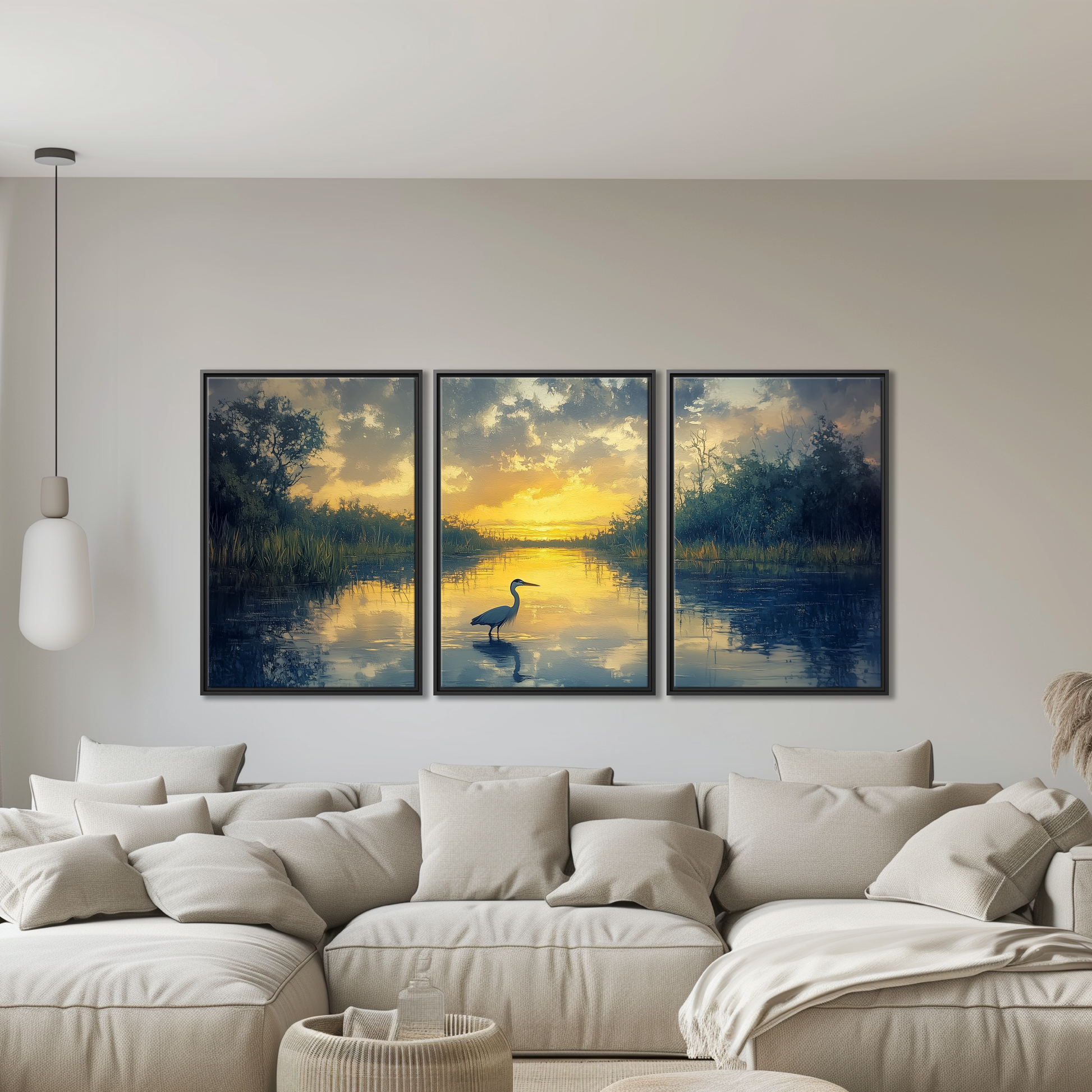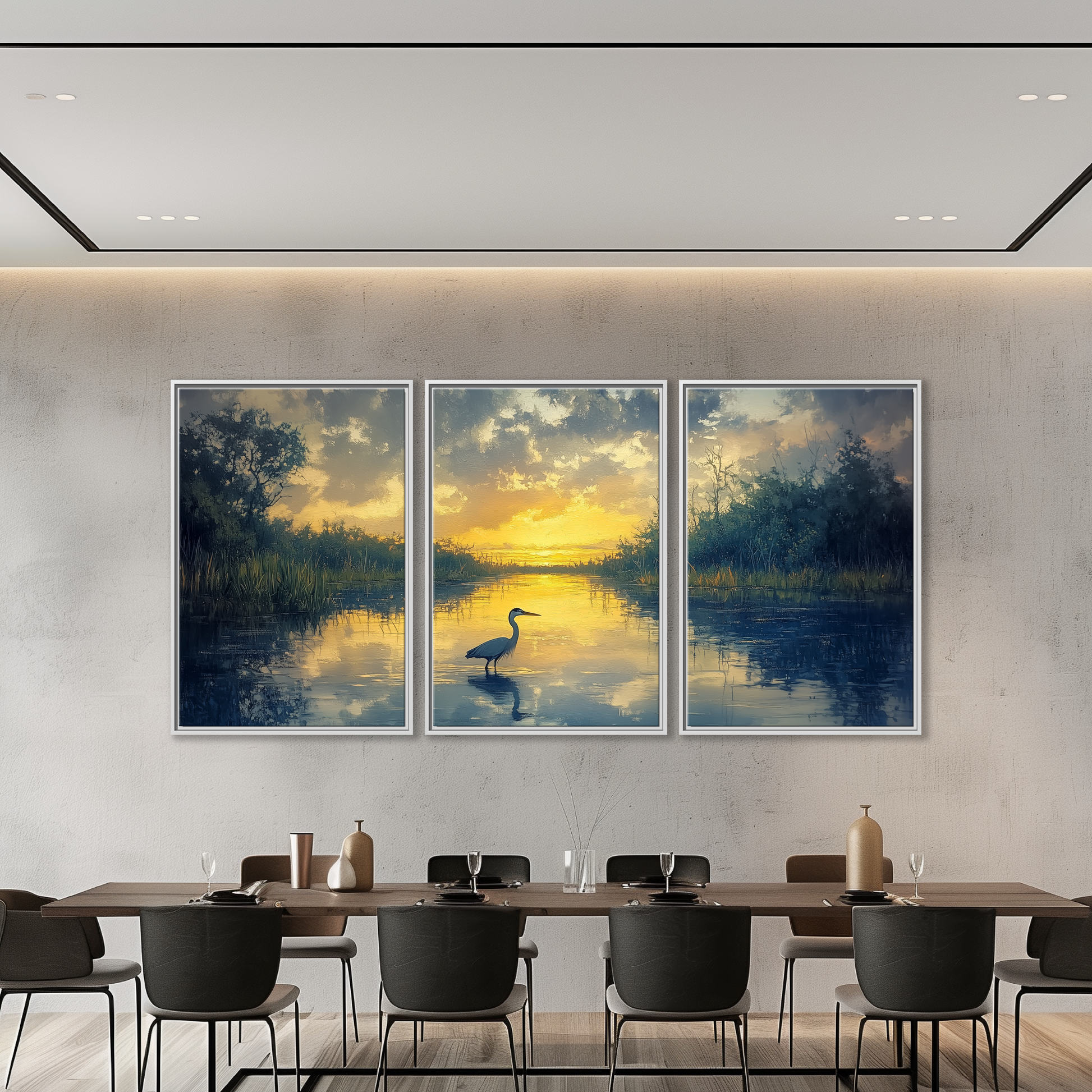 Immerse yourself in the tranquil beauty of a coastal evening with this stunning wetland silhouette canvas, where a solitary heron graces the golden hour artwork in perfect harmony with its mirrored reflection. Inspired by Florida's serene marshlands, this piece captures the dramatic landscape at sunset, evoking peaceful moments by the water’s edge. Whether displayed as a single canvas or a captivating three panel layout, it brings a touch of wildlife wall decor elegance to any space.