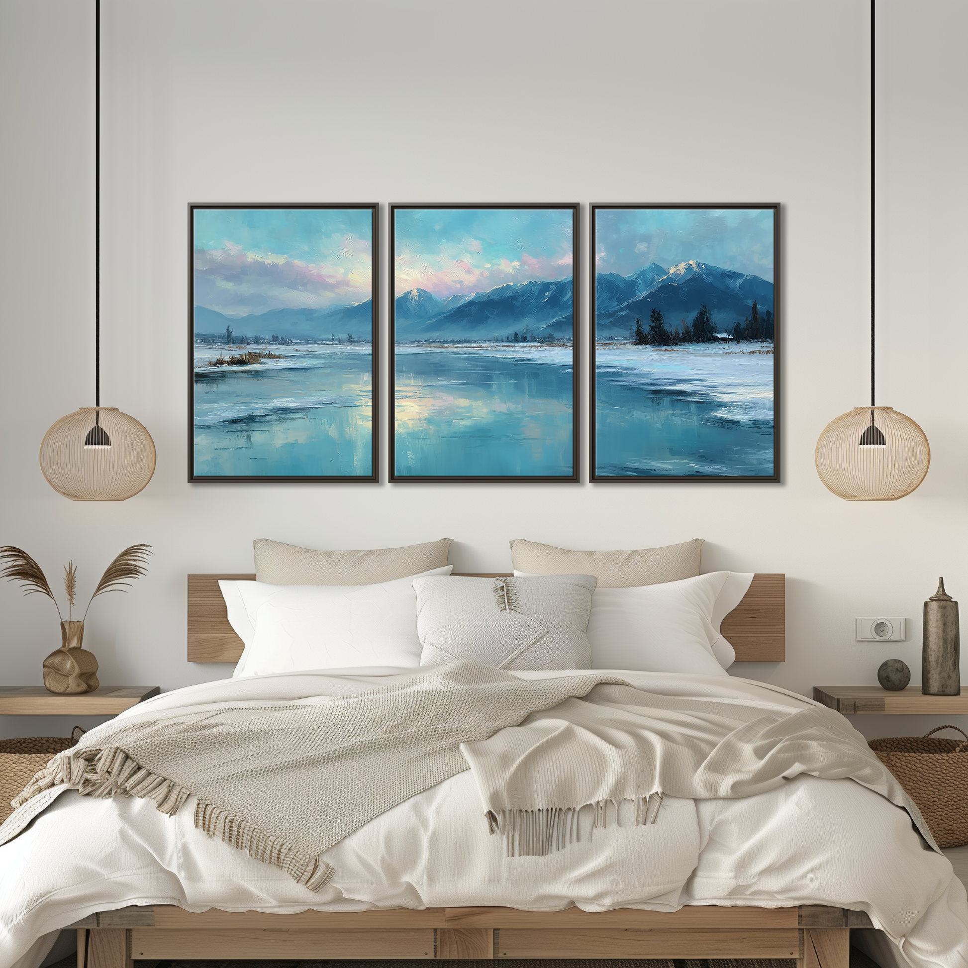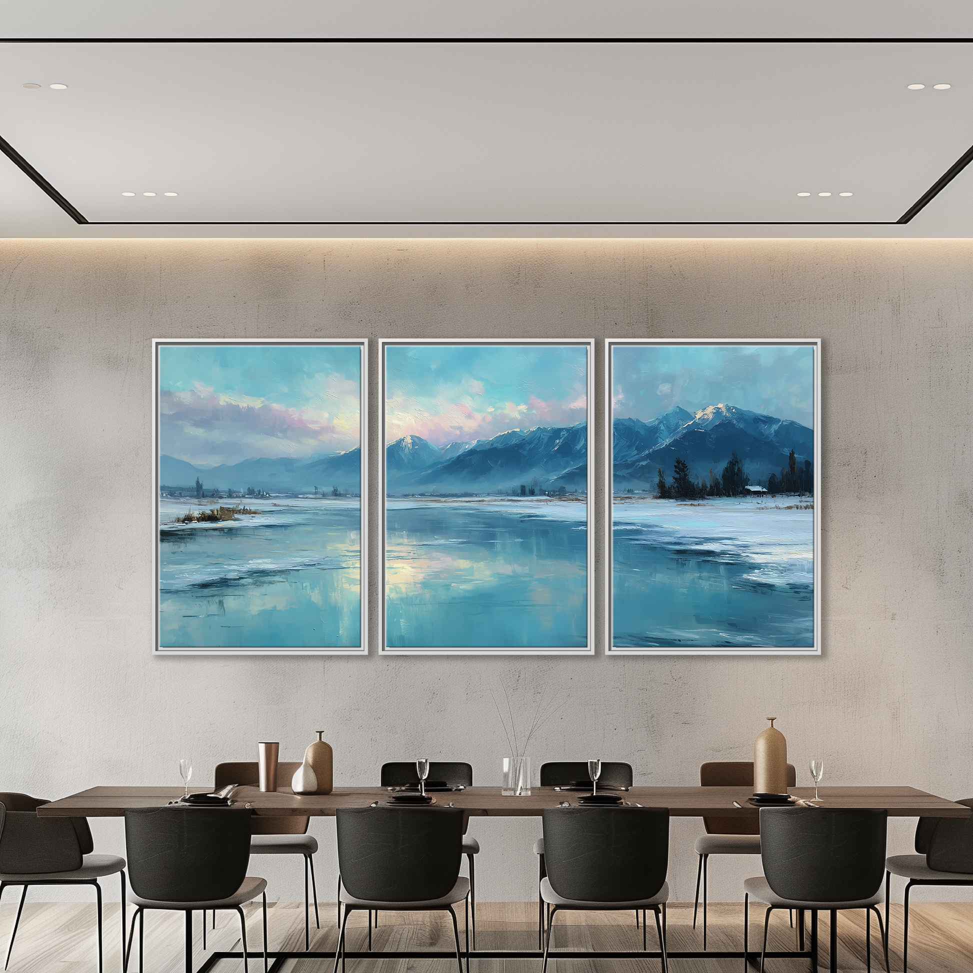 Transform your home with the serene beauty of a frozen lake art piece that captures the majestic mountain landscape in stunning detail. This snow peaks print brings the tranquil essence of blue ice painting and alpine scenery into your living space, evoking peaceful water reflections beneath soft pastel skies. Perfect for those seeking a cabin gift idea or winter wall decor that blends modern wilderness charm with timeless elegance.