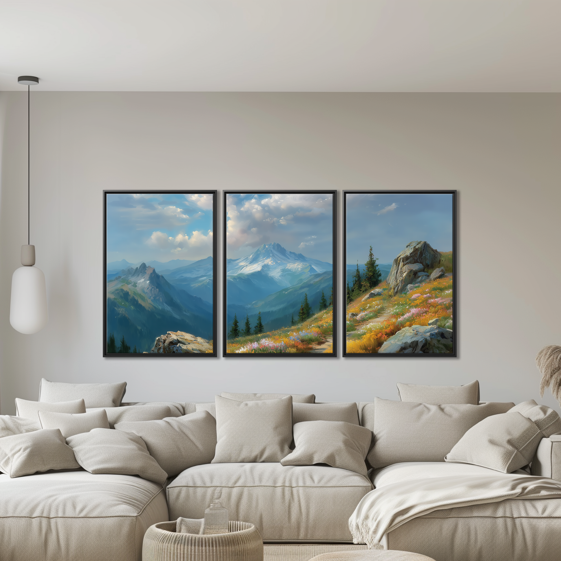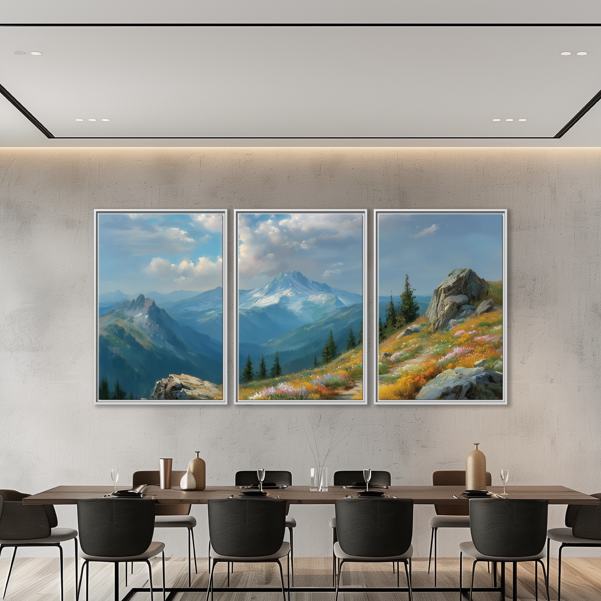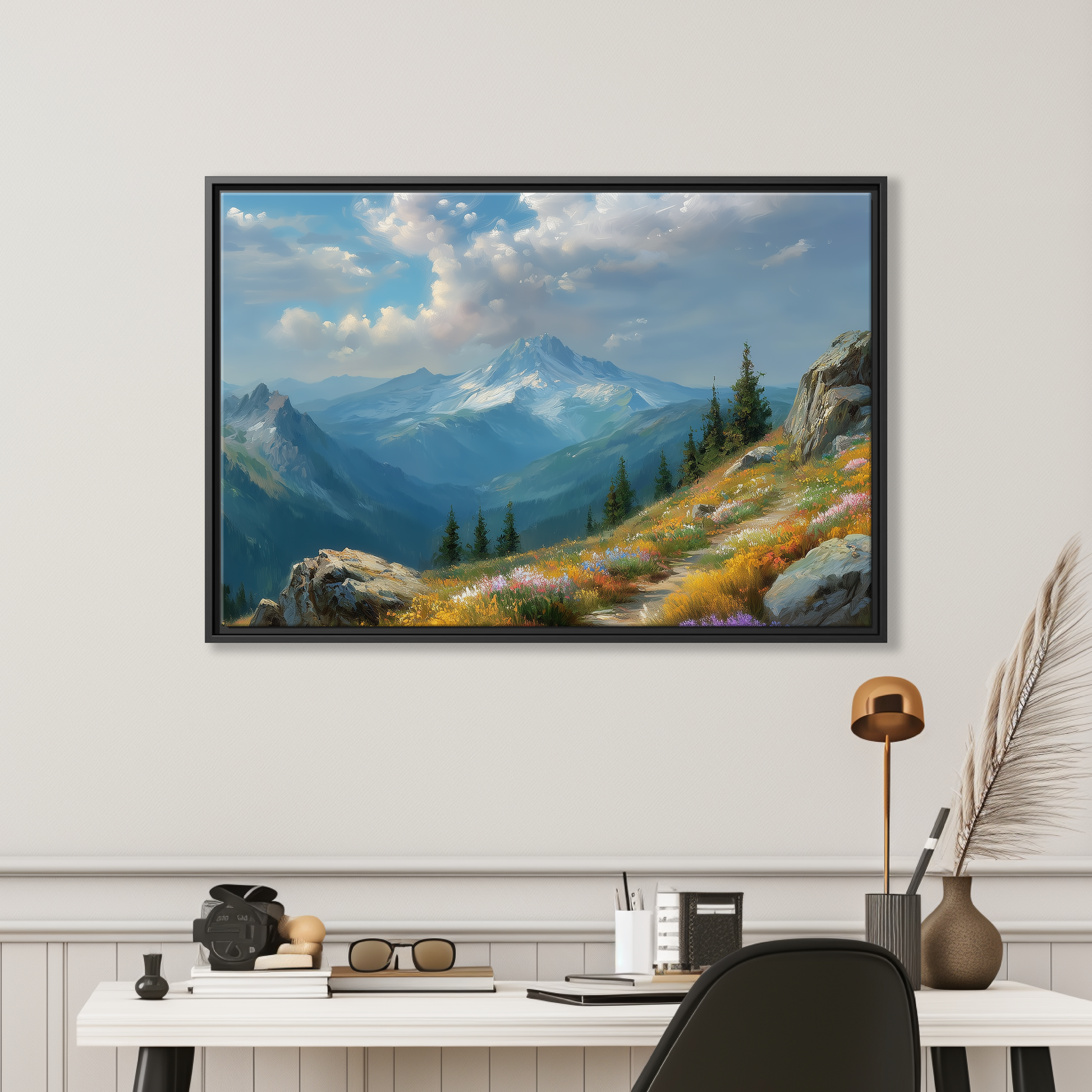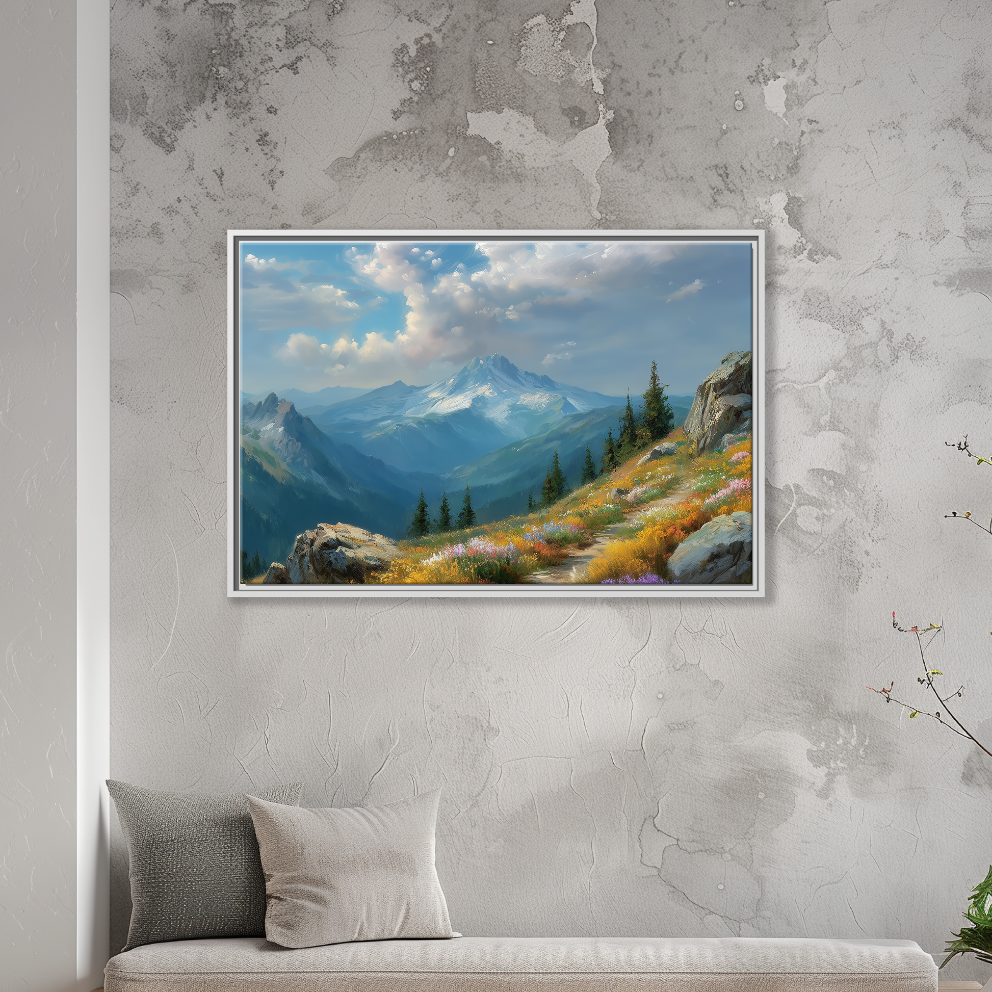 Immerse yourself in the serene beauty of the Goat Rocks Wilderness with this captivating canvas wall art that brings the vibrant alpine wildflowers and rugged Cascade Mountains right into your home. Inspired by Washington State's breathtaking landscapes, this piece celebrates the colorful meadow paintings and winding hiking trails that define the Pacific Northwest's outdoor adventure spirit. Perfect for nature lovers and trail enthusiasts, it transforms any space into a tranquil escape filled with natural wonder.