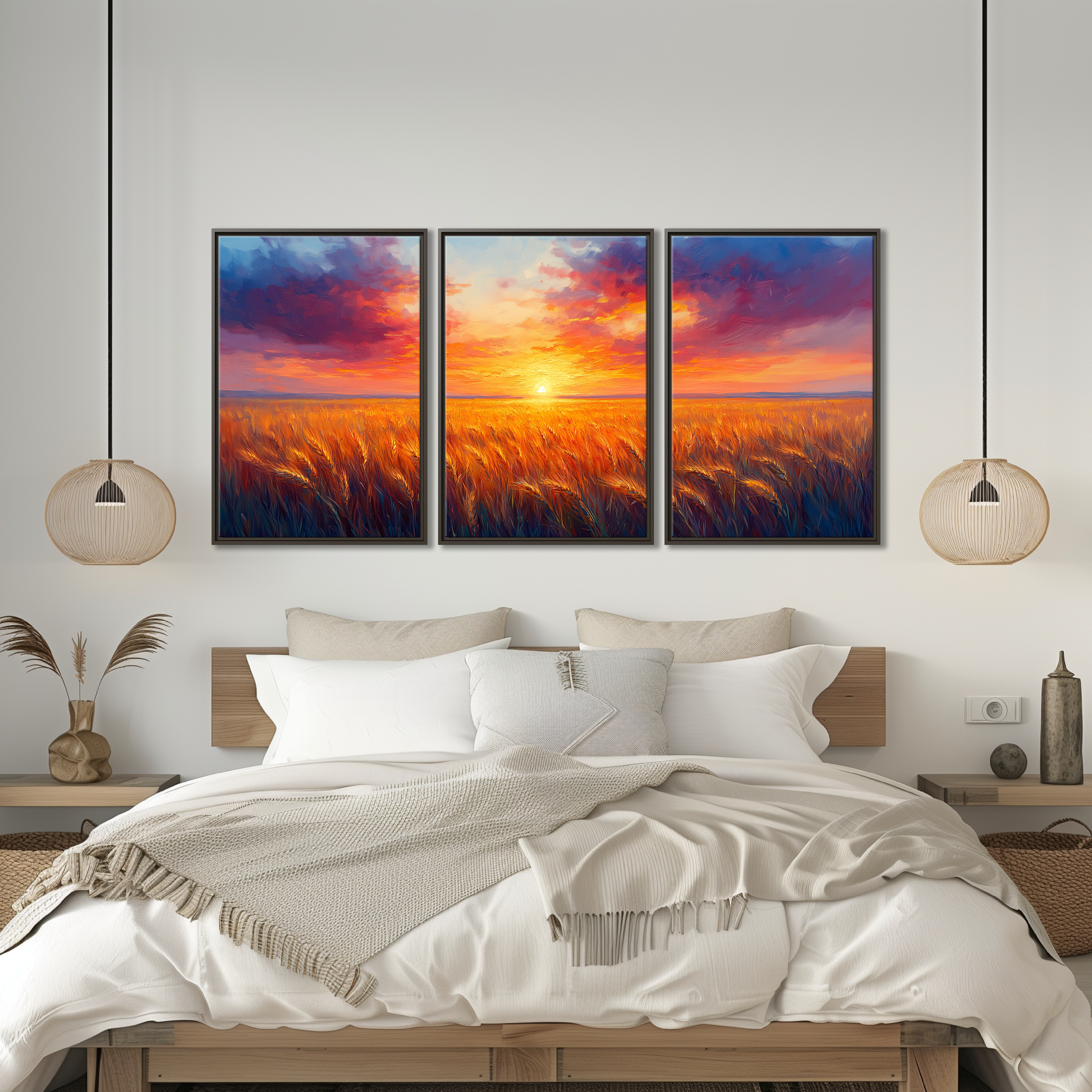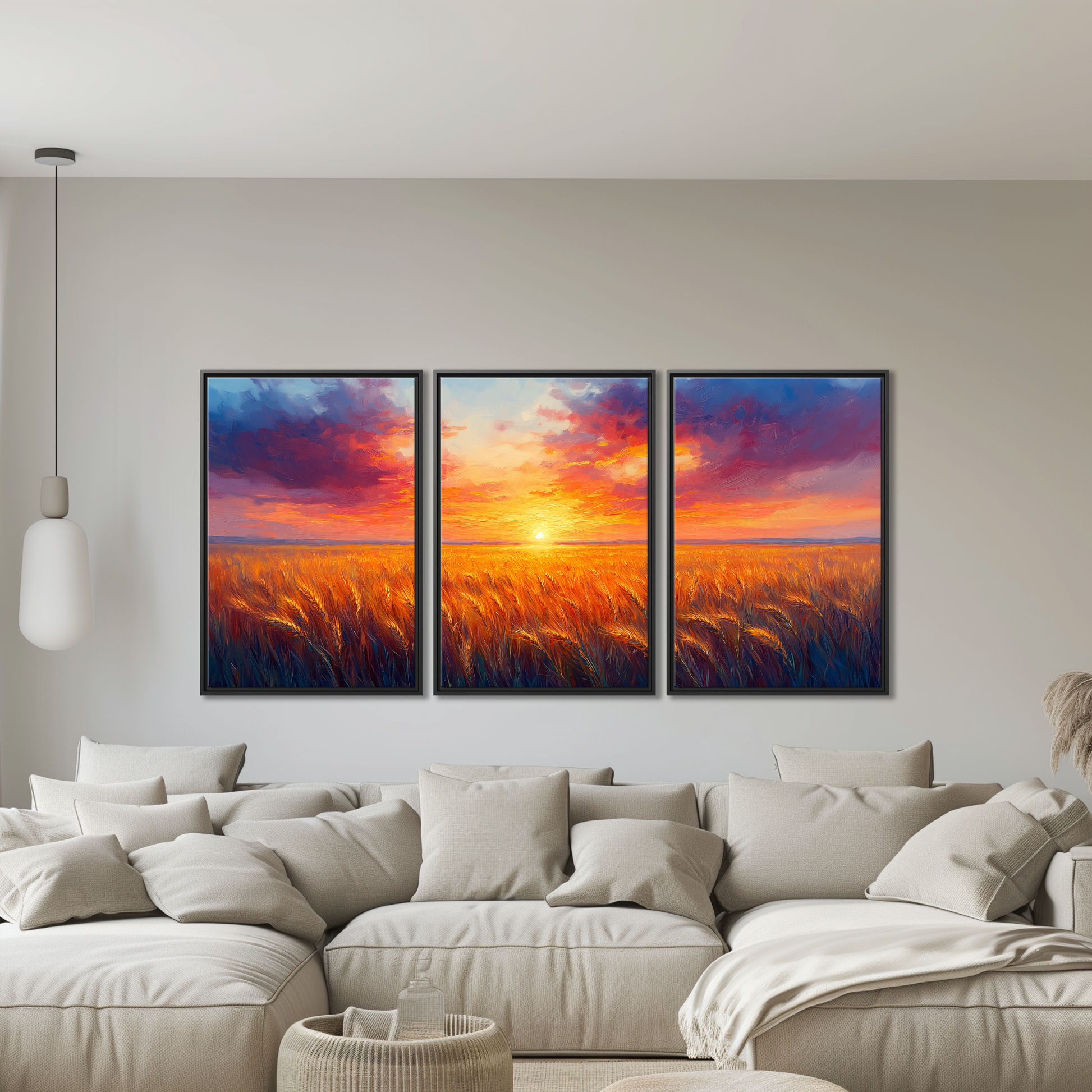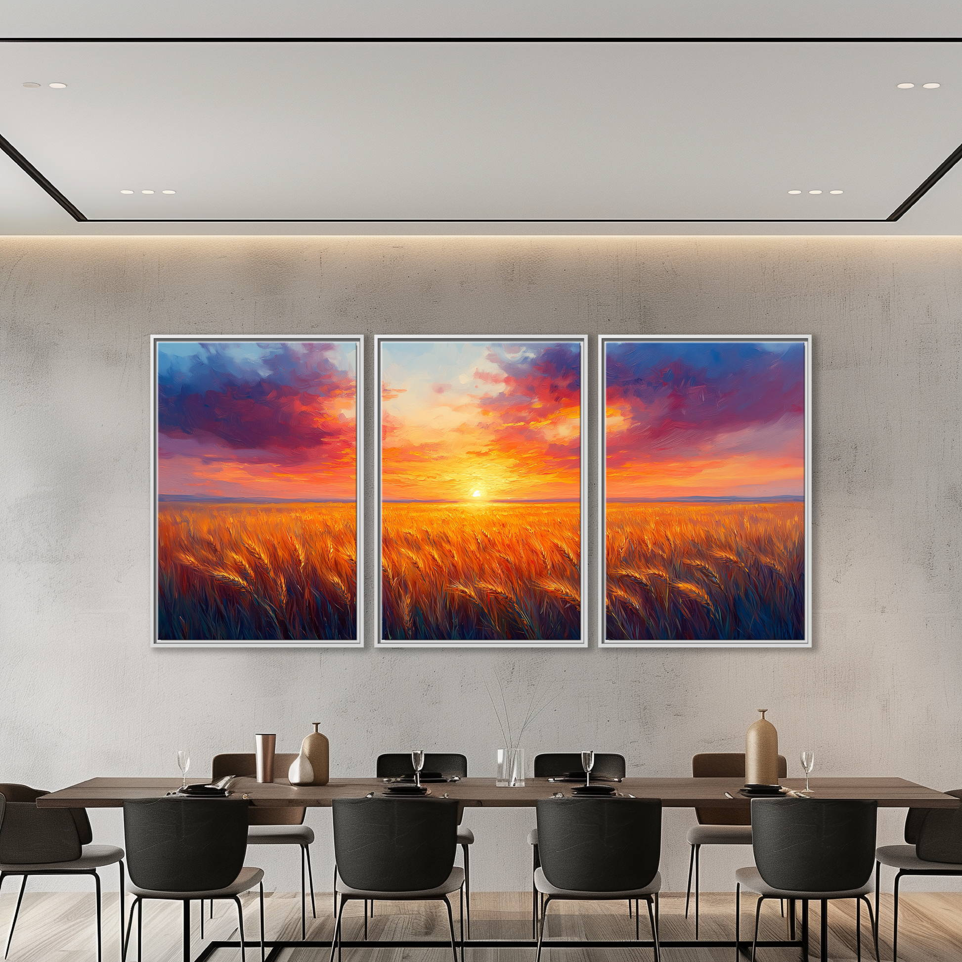 Experience the serene beauty of the Midwest with this stunning Kansas wheat sunset canvas, capturing the golden hour’s warm glow across sprawling fields. Inspired by America's heartland, this artwork brings a luminous triptych or single-panel statement piece perfect for farmhouse wall prints or rustic field design lovers. Each piece evokes the peaceful rural landscape set aglow by a fiery sky painting that celebrates the natural charm of Kansas.