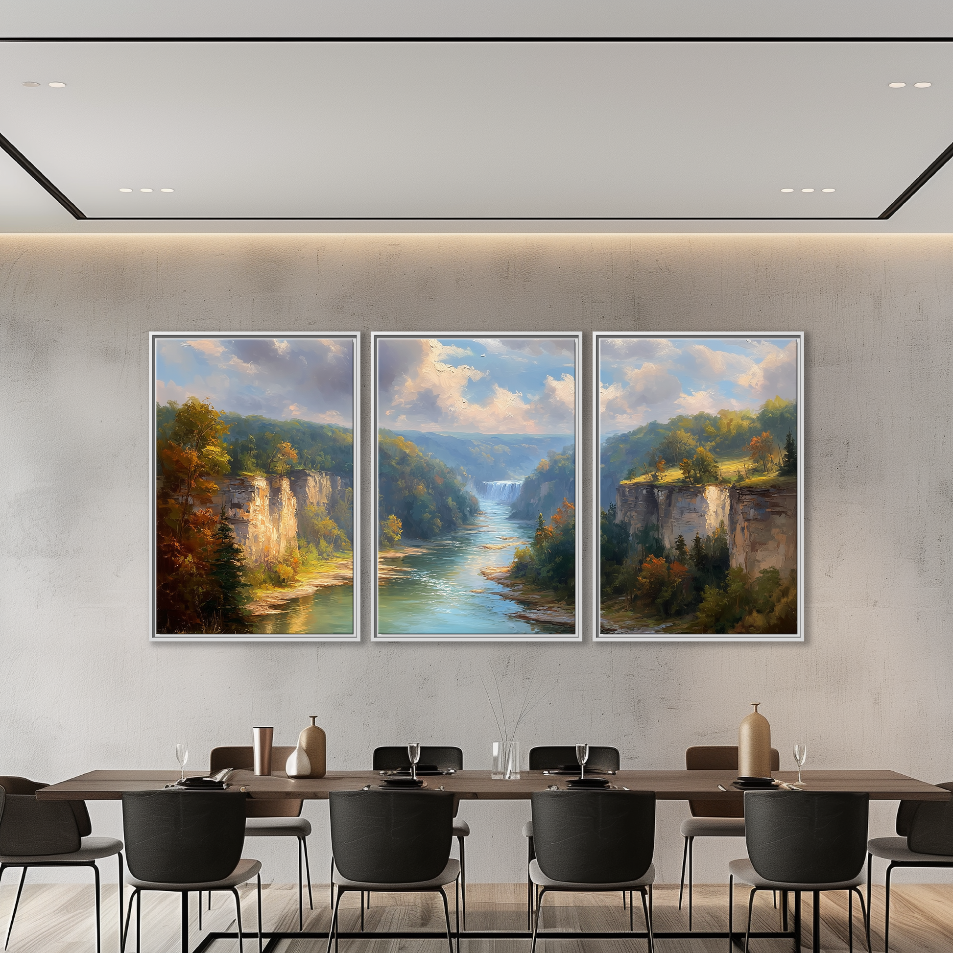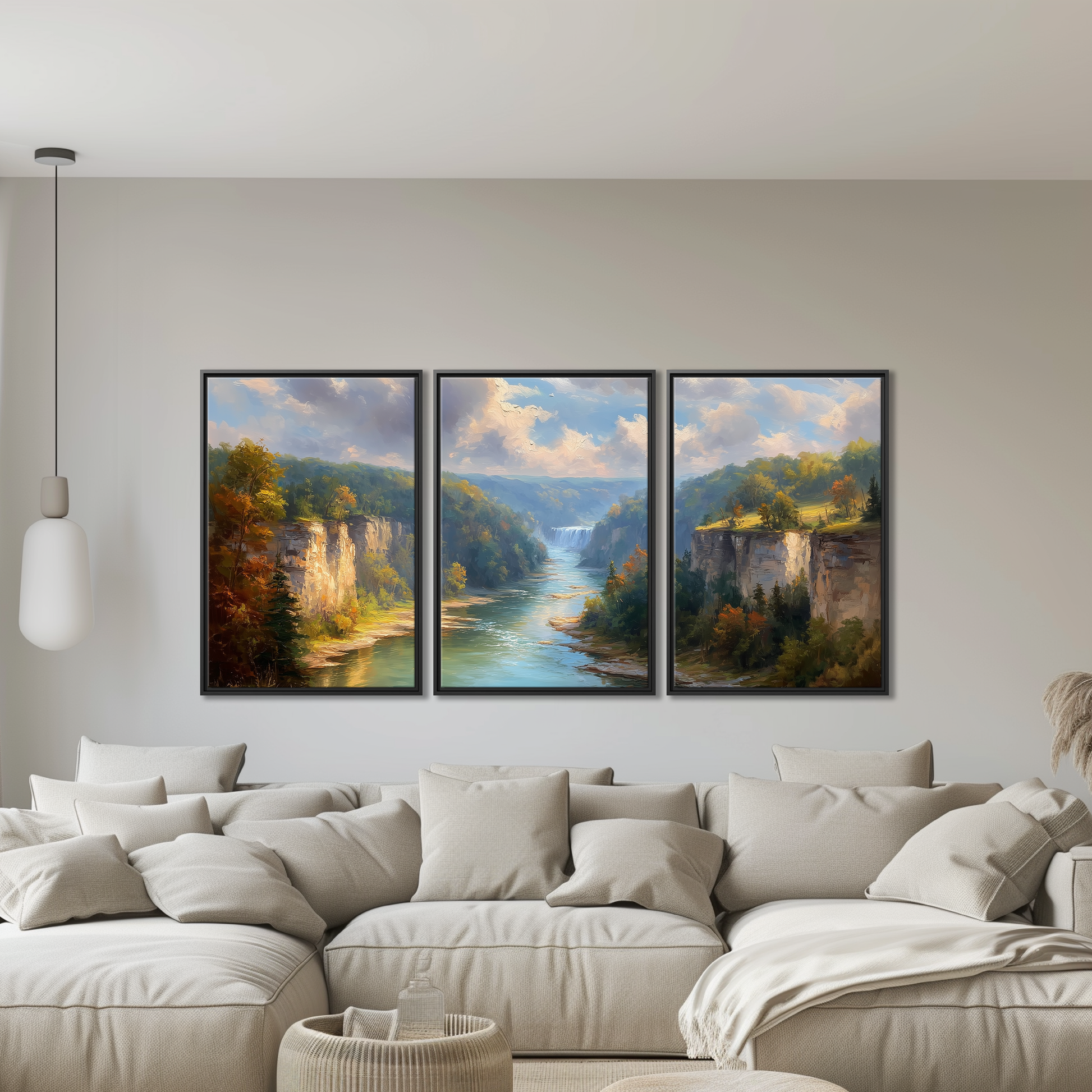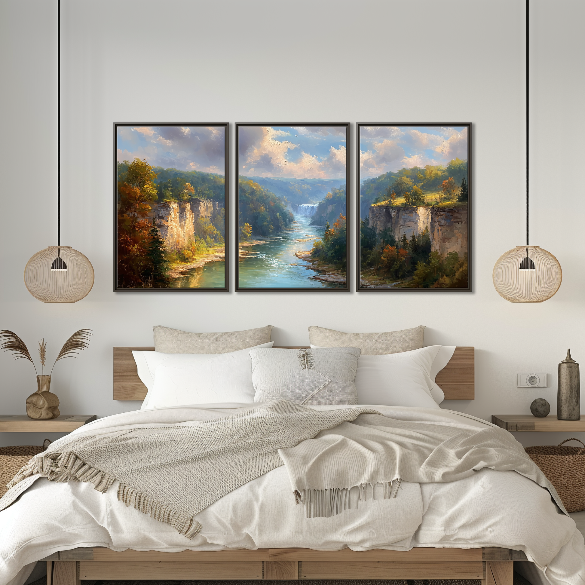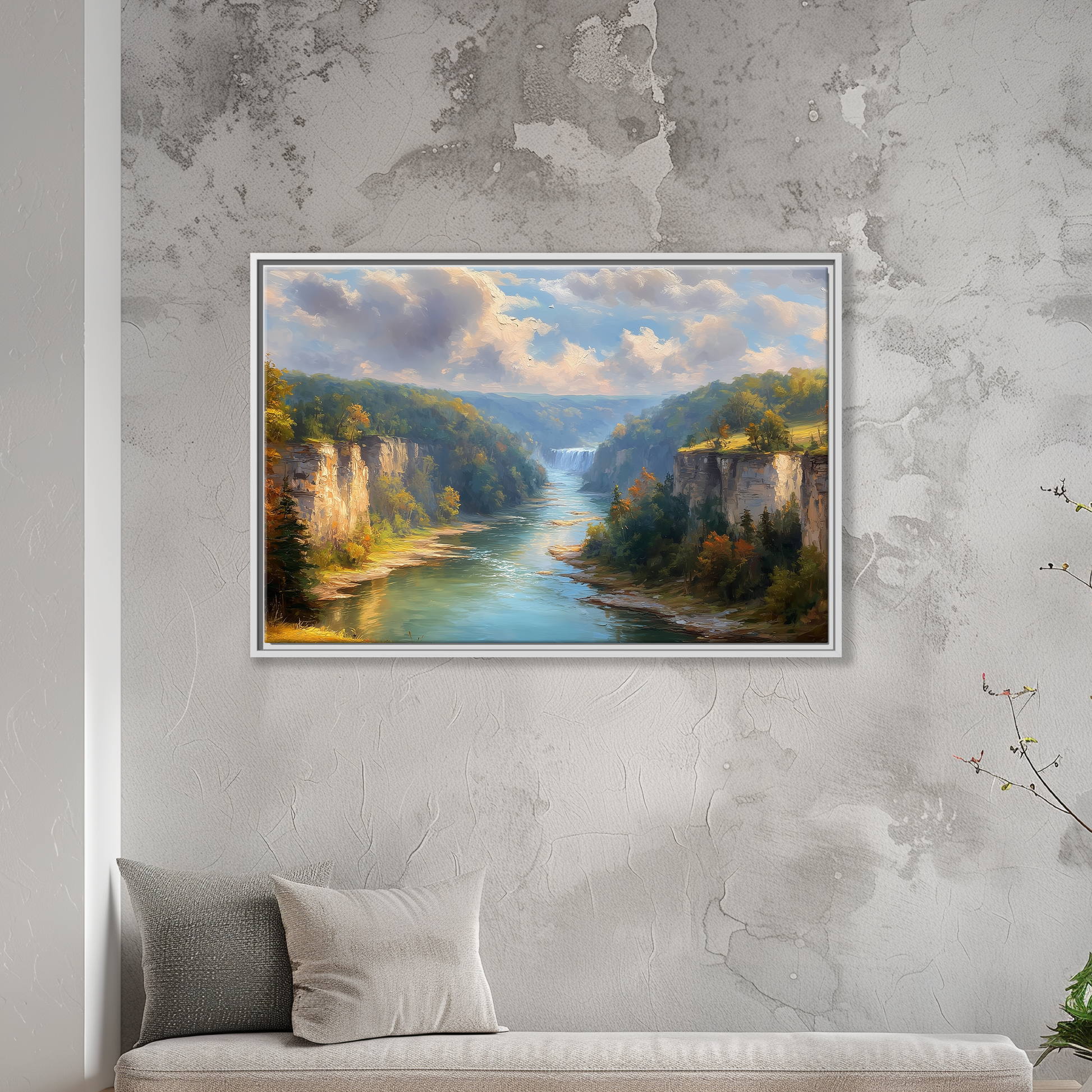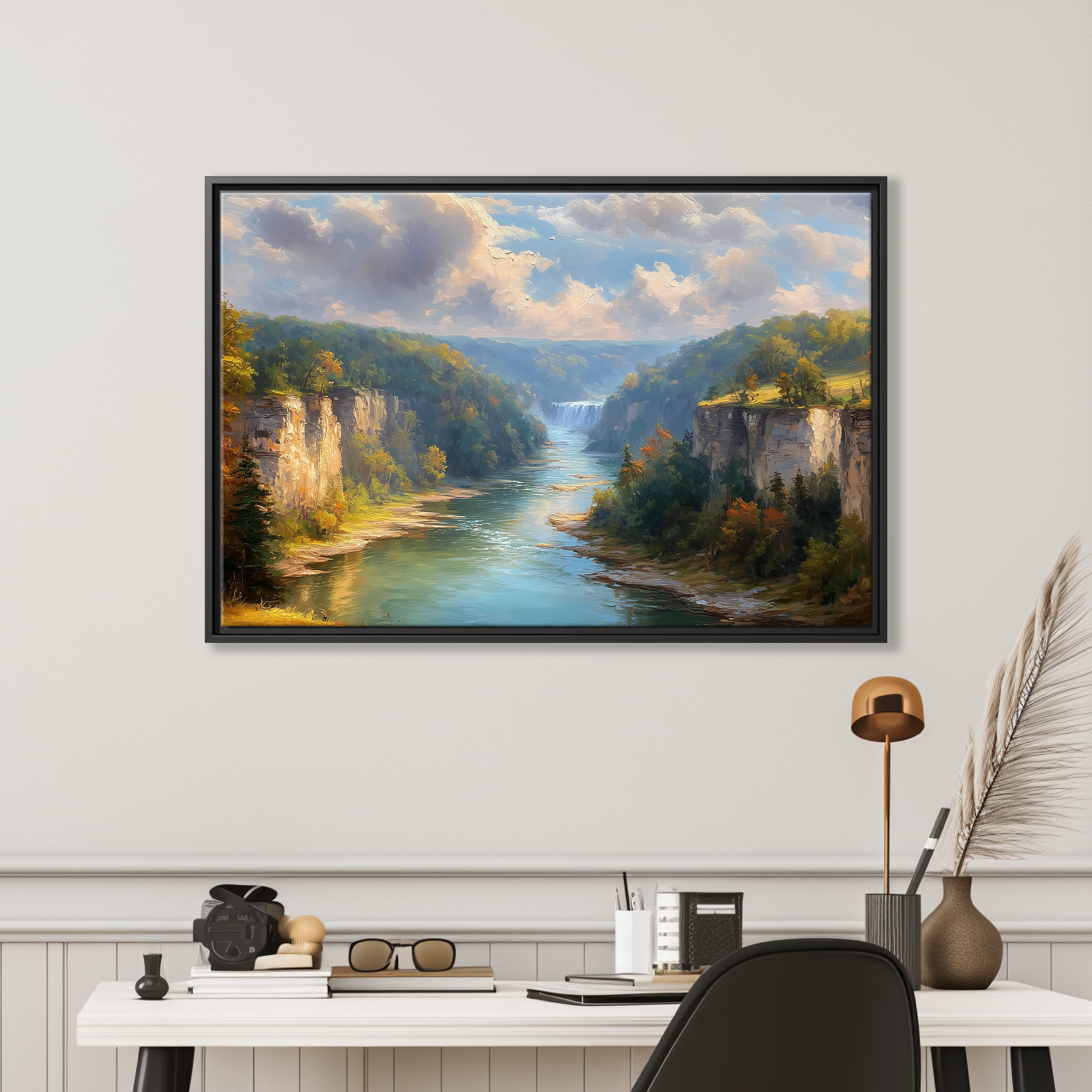 Experience the breathtaking beauty of Letchworth Gorge, often called the Grand Canyon of the East, captured in this stunning autumn landscape canvas. Featuring golden foliage, cascading waterfalls, and towering limestone cliffs, this artwork brings the serene charm of New York's state parks into your home. Perfect for lodge wall hanging or as a hiking gift idea, it celebrates nature’s vibrant fall colors with rich detail and depth.