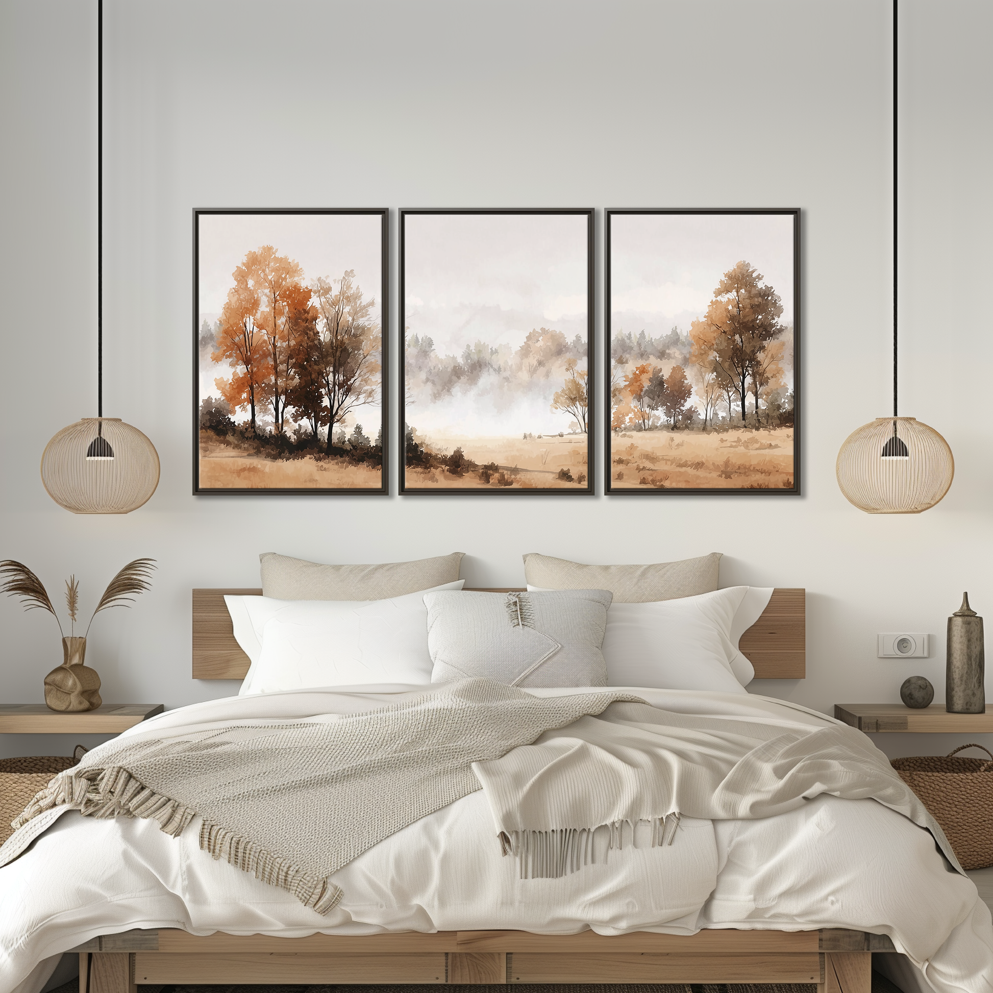 Experience the tranquil beauty of a misty landscape art piece that captures the essence of autumn trees canvas in soft watercolor fall set hues. Inspired by peaceful design and the gentle embrace of foggy morning print, this artwork brings a serene countryside ambiance into your home. Perfect for those who cherish neutral wall decor with a rustic countryside charm.